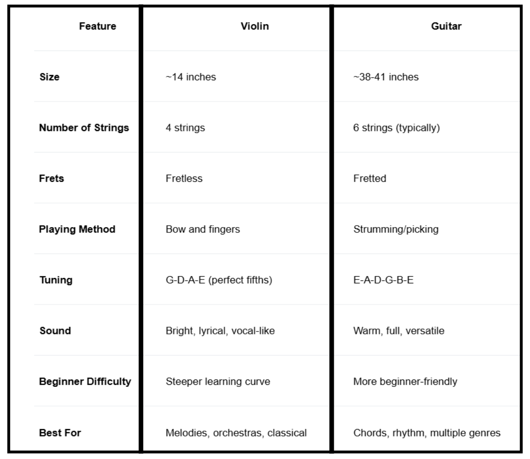 Because of this tuning difference, violins are naturally suited for expressive melodies, while guitars excel at chords, harmony, and rhythm.