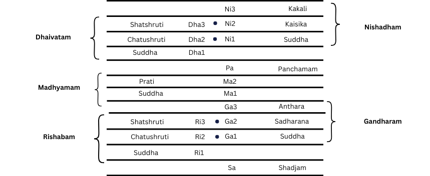 These 16 swarasthanas are the same in all kinds of music but they have different names. For example, The Carnatic raga Mohanam is equivalent to the Hindustani raga Bhoopali, and the Carnatic raga Sankarabharanam is equivalent to the Western C Major scale.